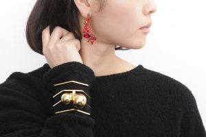 大ぶりでクラシックなモチーフの耳飾りに、モダンでエレガントなバングルを合わせて