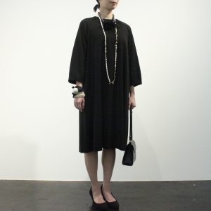 普段使いにもおすすめのゆったりとしたブラックドレス。きちんと感を残しつつ、かっちりとしすぎない優しい印象に見せてくれます。