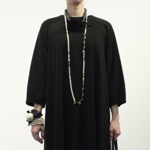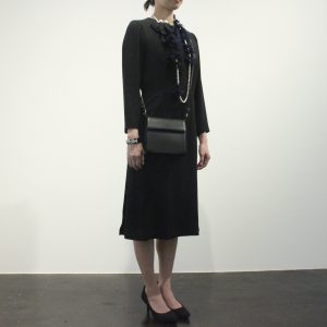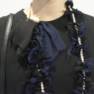 やわらかなシフォンのブラックリボン×コットンパールのネックレスでさりげない華やかさを。