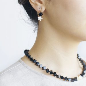 こちらは、深い色みのブラックオニキスと軽やかなシェルの涼しげな組み合わせです。