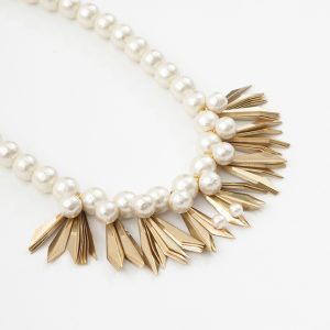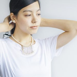 まずは大ぶりモチーフのネックレスから。カーテンのように連なったコットンパールのネックレスは、5月に仲間入りしたばかりの新作。見た目以上に軽いつけ心地が特徴です。