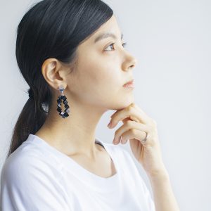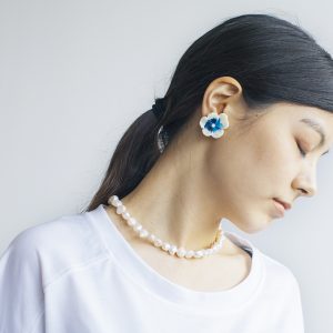耳元には、職人の手描き模様にあたたかみを感じるパンジーのイヤリングをあわせました。鮮やかなブルーが、夏らしい清涼感をそえてくれます。
