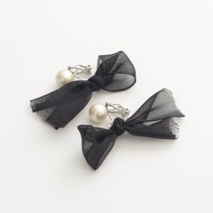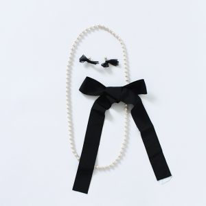 2つめは取り外しできるブラックリボンがついたネックレスに、リボンとコットンパールが愛らしい耳飾りのセットです。