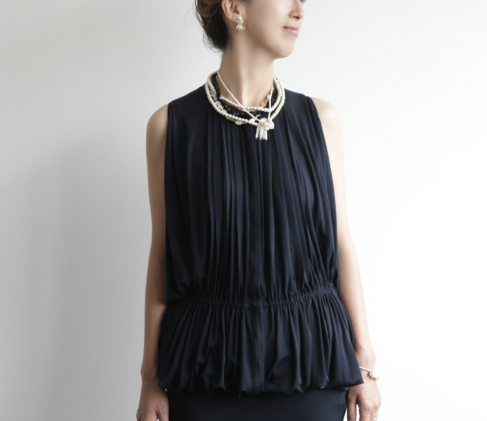 色使いに深みを出すため、ブラックのネックレスを重ねたのがポイント。