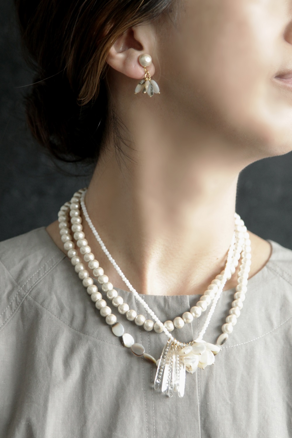 並んだコットンパールとシェルが愛らしいお揃いのお耳飾りを合わせるのも