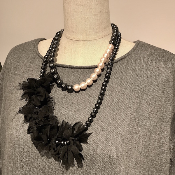 シンプルなデザインだからこそ、胸元に重ねるコスチュームジュエリーによって